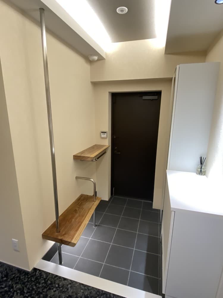 玄関収納の対面にベンチと手摺・傘かけを設置し、使いやすさを重視しました。