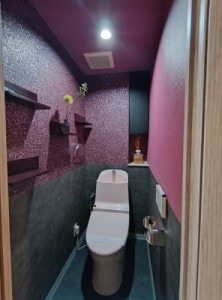 こちらは、まだ変えるには新しい既存のピンクの便器を活かすため、逆転の発想で攻めのインテリアを選びました。